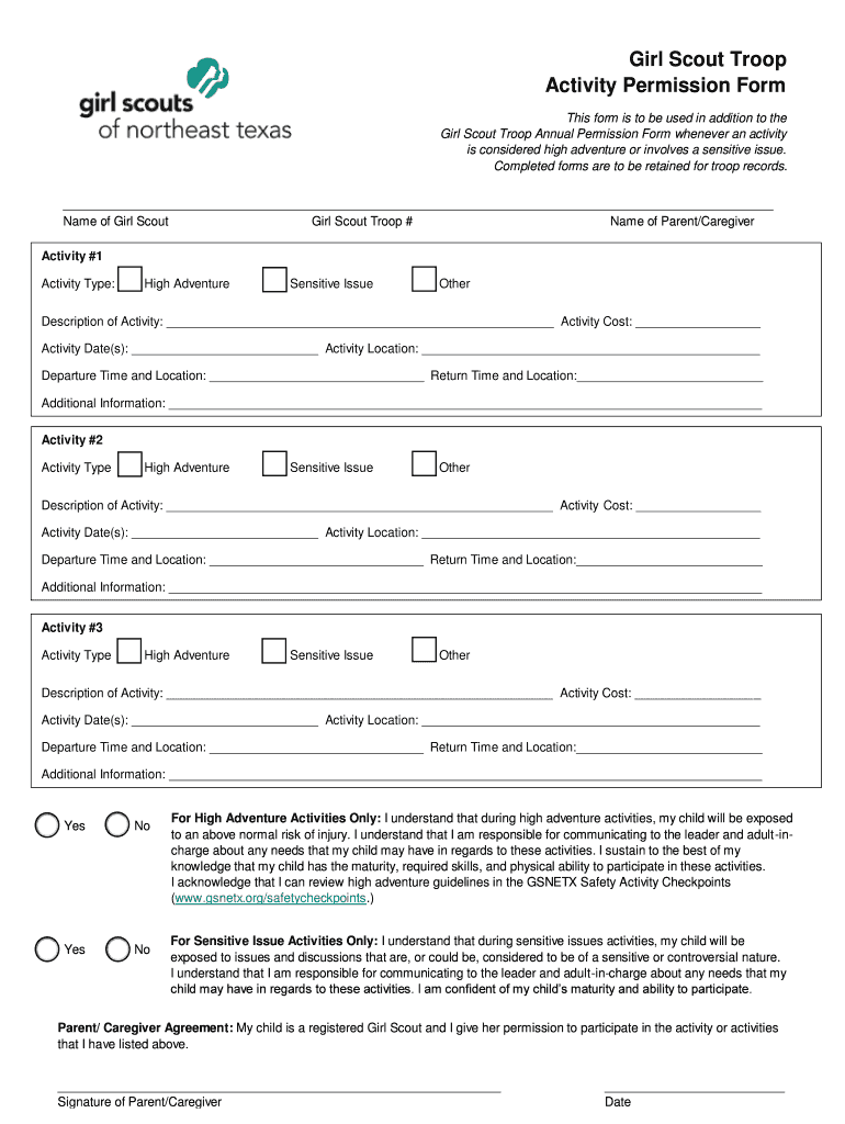 Girl Scout Troop Activity Permission Form This form is to be used in addition to the Girl Scout Troop Annual Permission Form whenever an activity is considered high adventure or involves a sensitive