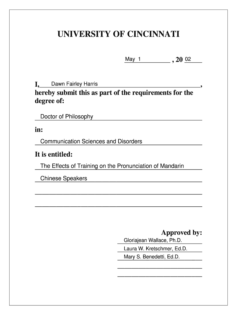 UNIVERSITY OF CINCINNATI May 1 02, 20 Dawn Fairly Harris I, hereby submit this as part of the requirements for the degree of:Doctor of Philosophy in: Communication Sciences and Disorders It is entitled: