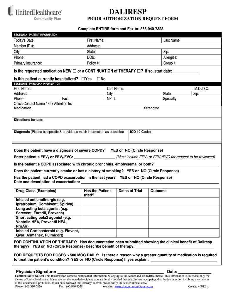 PRIOR AUTHORIZATION REQUEST FORM Complete ENTIRE form and Fax to: 8669407328 SECTION A PATIENT INFORMATIONTodays Date: Member ID #: City: Phone: Primary Insurance:First Name: Address: State: DOB: