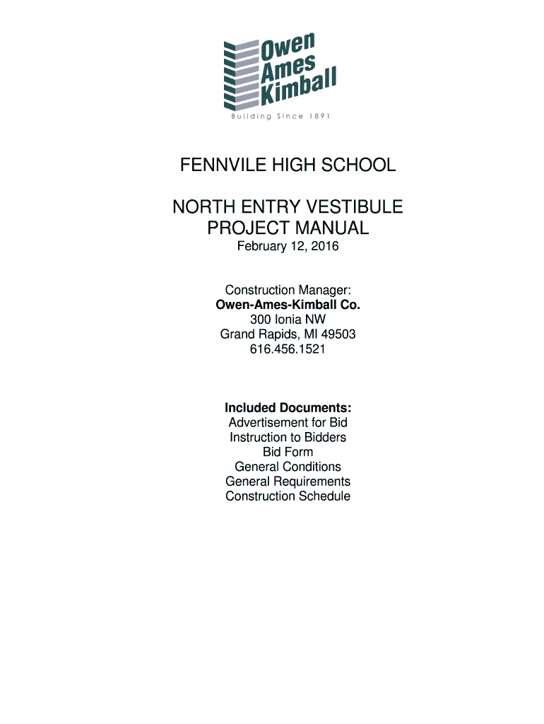 FERTILE HIGH SCHOOL NORTH ENTRY VESTIBULE PROJECT MANUAL February 12, 2016Construction Manager: OwenAmesKimball Co. 300 Ionic NW Grand Rapids, MI 49503 616.456.1521Included Documents: Advertisement