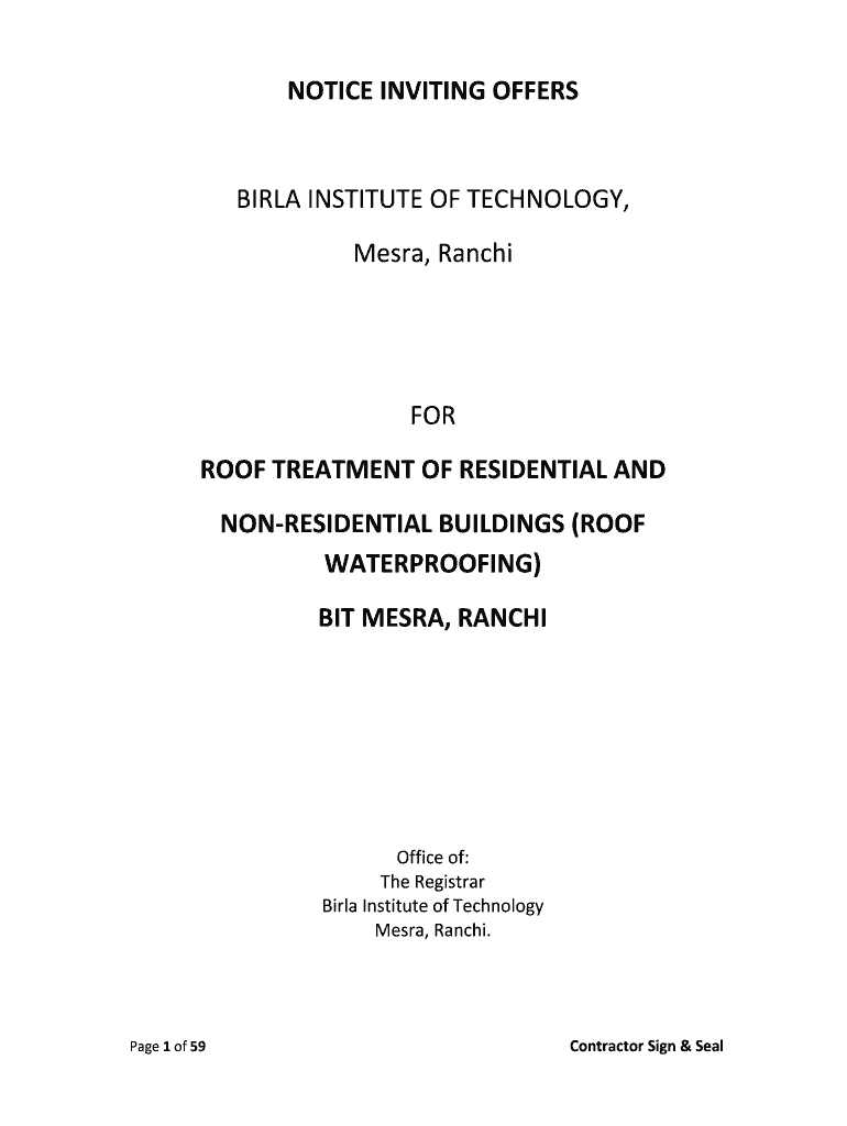 NOTICE INVITING OFFERS BIR LA INSTITUTE OF TECHNOLOGY, Mesa, Franchisor ROOF TREATMENT OF RESIDENTIAL AND NONRESIDENTIAL BUILDINGS (ROOF WATERPROOFING) BIT MESA, RANCHIOffice of: The Registrar Barley