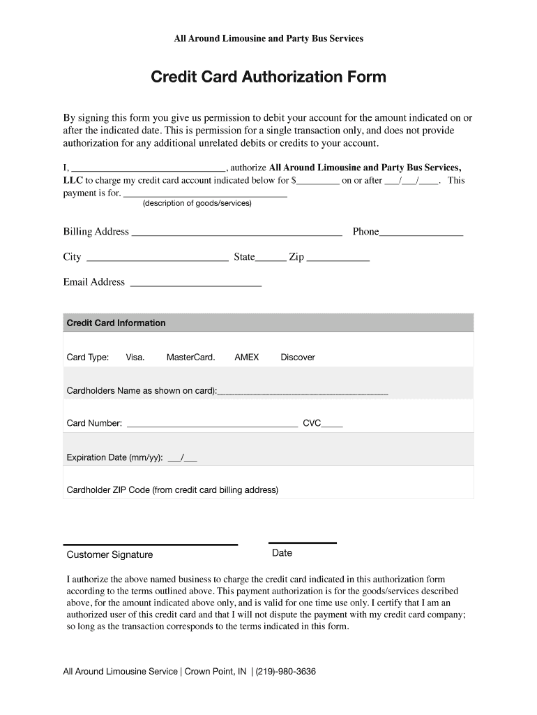 All Around Limousine and Party Bus ServicesCredit Card Authorization Form By signing this form you give us permission to debit your account for the amount indicated on or after the indicated date.