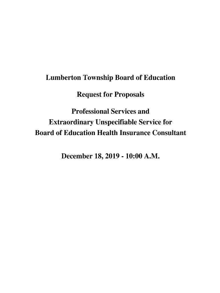 Lumberton Township Board of Education Request for Proposals Professional Services and Extraordinary Unspecifiable Service for Board of Education Health Insurance Consultant December 18, 2019 10:00