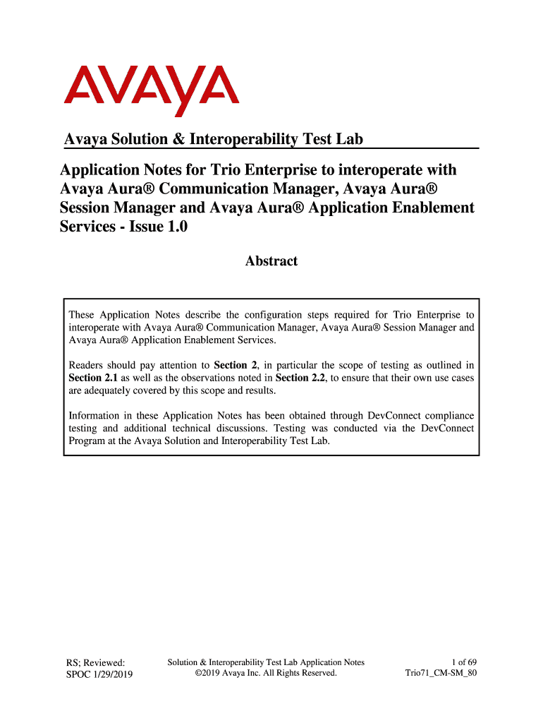 Avaya Solution & Interoperability Test Lab Application Notes for Trio Enterprise to interoperate with Avaya Aura Communication Manager, Avaya Aura Session Manager and Avaya Aura Application Enablement