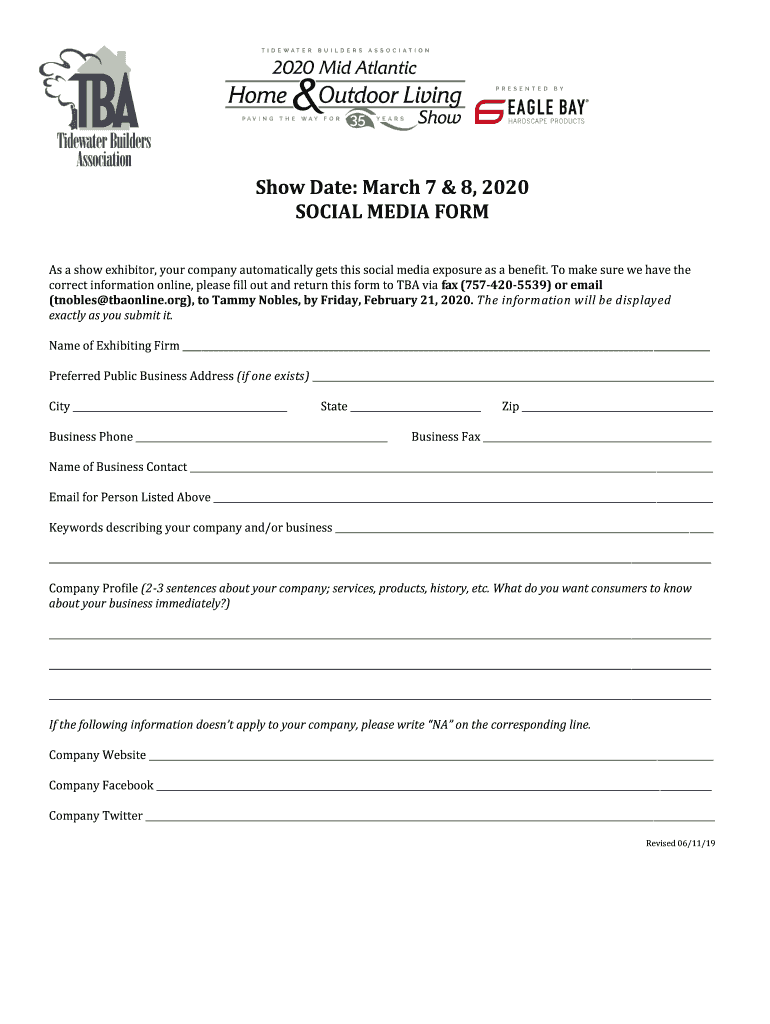 Show Date: March 7 & 8, 2020 SOCIAL MEDIA FORM As a show exhibitor, your company automatically gets this social media exposure as a benefit. To make sure we have the correct information online, please