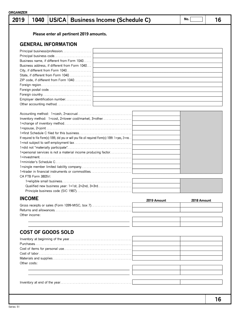 ORGANIZER20191040 US/CA Business Income (Schedule C)16No. Please enter all pertinent 2019 amounts. Last year\'s amounts are provided for your reference. GENERAL INFORMATION