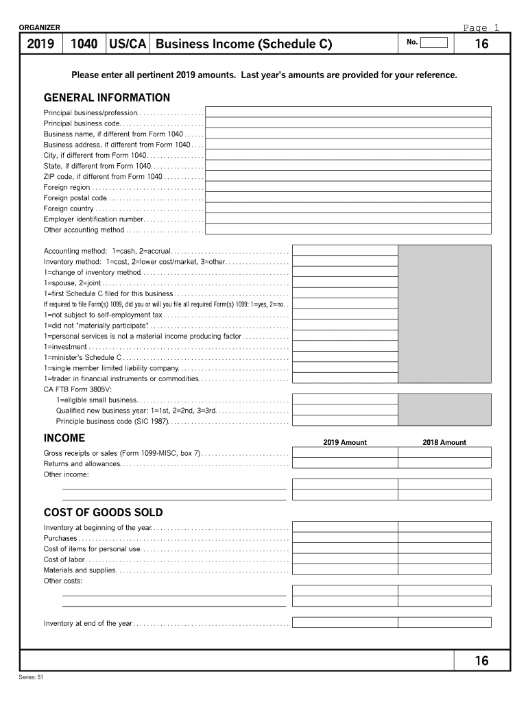 Page 1ORGANIZER20191040 US/CA Business Income (Schedule C)16No. Please enter all pertinent 2019 amounts. Last year's amounts are provided for your reference. GENERAL INFORMATION Principal business/profession.