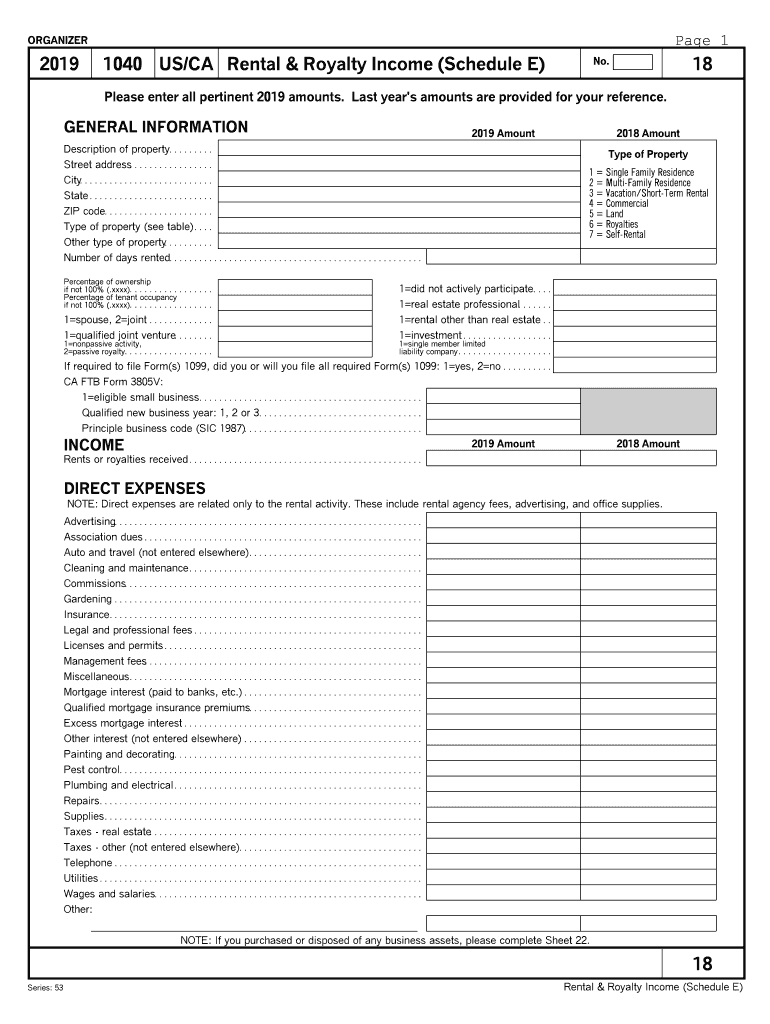 Page 1ORGANIZER20191040 US/CA Rental & Royalty Income (Schedule E)18No. Please enter all pertinent 2019 amounts. Last year's amounts are provided for your reference. GENERAL INFORMATION2019 Amount2018