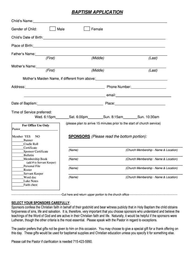 BAPTISM APPLICATION Child's Name: Gender of Child:MaleFemaleChilds Date of Birth: Place of Birth: Fathers Name: (First) (Middle) (Last) Mothers Name: (First) (Middle) (Last) Mothers Maiden Name, if