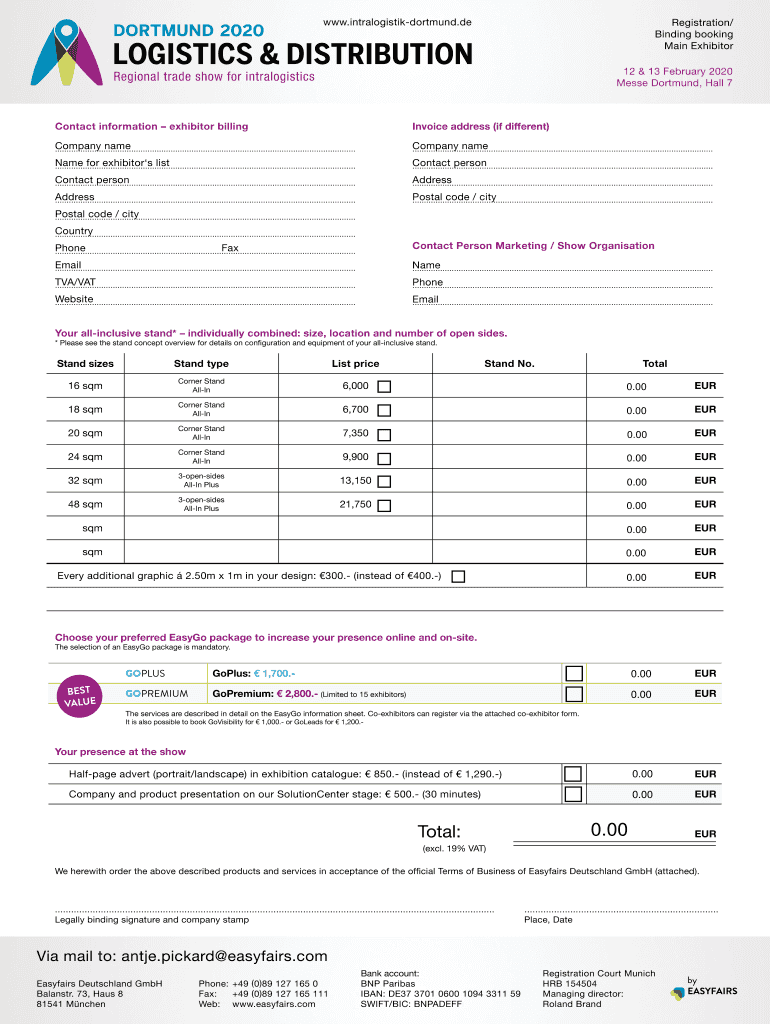 Www.intralogistikdortmund.deRegistration/ Binding booking Main Exhibitor 12 & 13 February 2020 Jesse Dortmund, Hall 7Regional trade show for intralogisticsContact information exhibitor billingInvoice