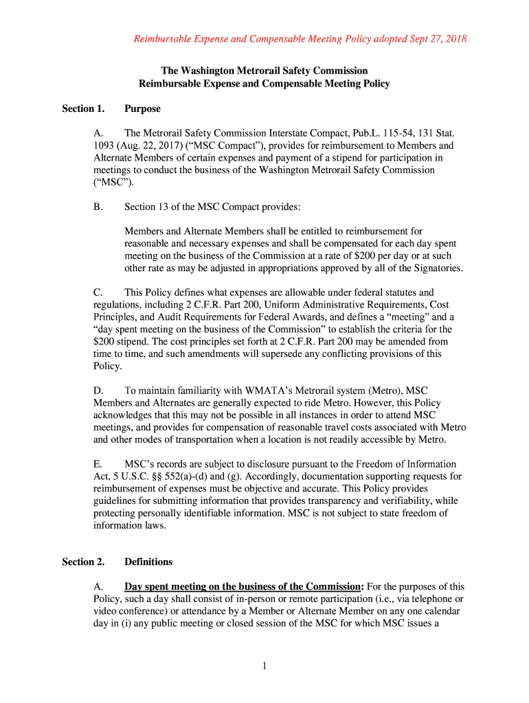 Reimbursable Expense and Compensate Meeting Policy adopted Sept 27, 2018