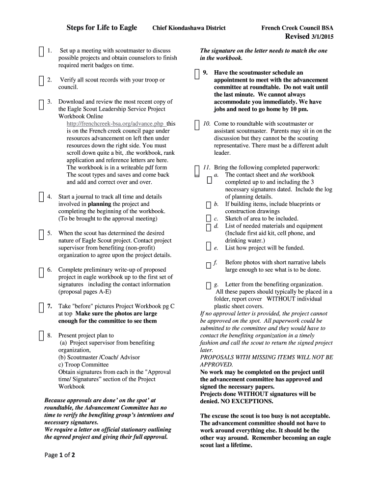 Steps for Life to Tallchief Kiondashawa District1. Set up a meeting with scoutmaster to discuss