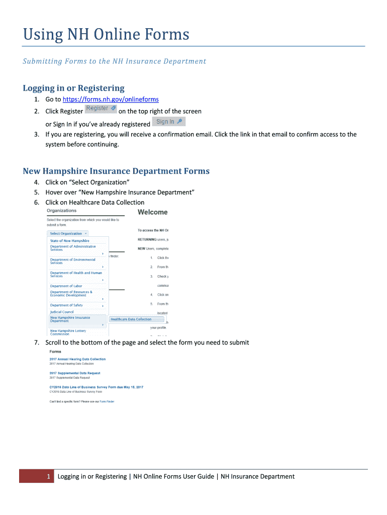 Using NH Online FormsSubmitting Forms to the NH Insurance DepartmentLogging in or Registering1. Gotohttps://forms.nh.gov/onlineforms 2. ClickRegisteronthetoprightofthescreenorSignInifyouvealreadyregistered