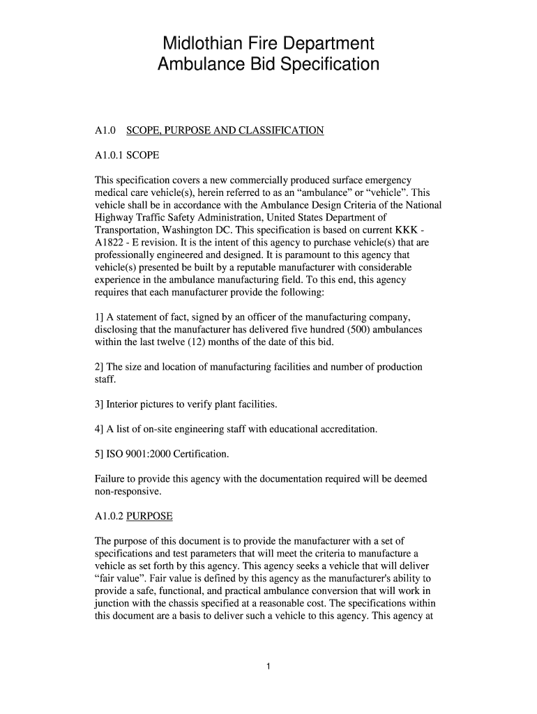 Midlothian Fire Department Ambulance Bid SpecificationA1.0SCOPE, PURPOSE AND CLASSIFICATIONA1.0.1 SCOPE This specification covers a new commercially produced surface emergency medical care vehicle(s),