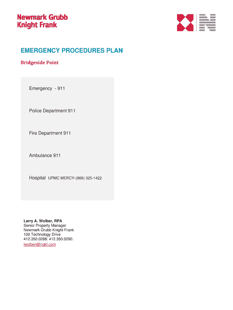 EMERGENCY PROCEDURES PLAN Bridge side PointEmergency 911Police Department 911Fire Department 911Ambulance 911Hospital UPMC MERCY(866) 3251422Larry A. Older, RPA Senior Property Manager Newark Grubs