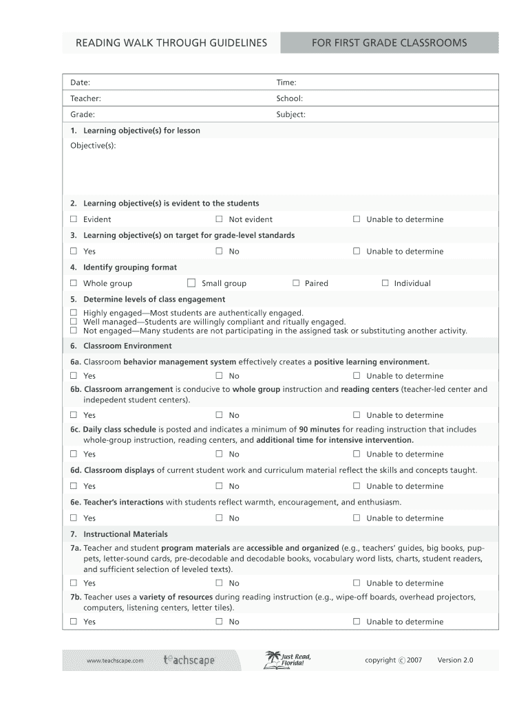 Get the free Reading Walkthrough Guidelines for First Grade Classrooms