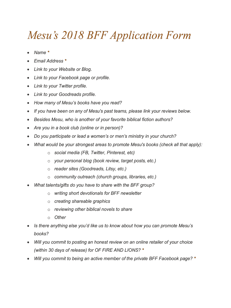 Name *Email Address *Link to your Website or Blog. Link to your Facebook page or profile. Link to your Twitter profile. Link to your Goo dreads profile. How many of