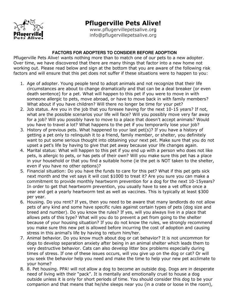 info@pflugervillepetsalive.orgFACTORS FOR ADOPTERS TO CONSIDER BEFORE ADOPTION