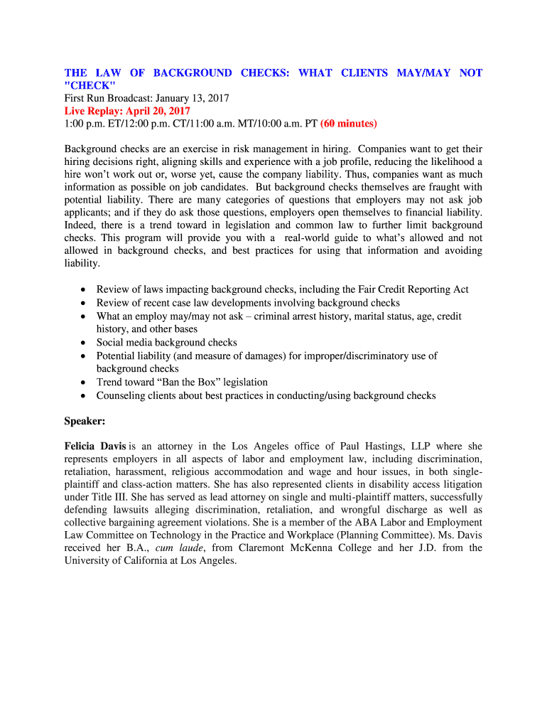 THE LAW OF BACKGROUND CHECKS: WHAT CLIENTS MAY/MAY NOT “CHECK First Run Broadcast: January 13, 2017, Live Replay: April 20, 2017 1:00 p.m. ET/12:00 p.m. CT/11:00 a.m. MT/10:00 a.m. PT (60 minutes)