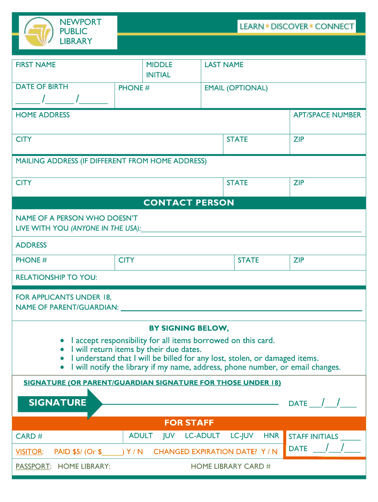 NEWPORT PUBLIC LIBRARY FIRST NAMEMIDDLE INITIATE OF BIRTH / / PHONE #LAST NAME EMAIL (OPTIONAL)HOME ADDRESS APT/SPACE NUMBERCITYSTATEZIPSTATEZIPMAILING ADDRESS (IF DIFFERENT FROM HOME ADDRESS) CITYCONTACT