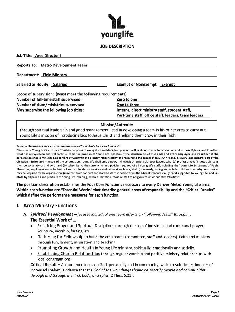 JOB DESCRIPTION Job Title: Area Director I Report To: Metro Development Team Department: Field Ministry Salaried or Hourly: SalariedExempt or Nonexempt: Exempt Scope of supervision: (Must meet the