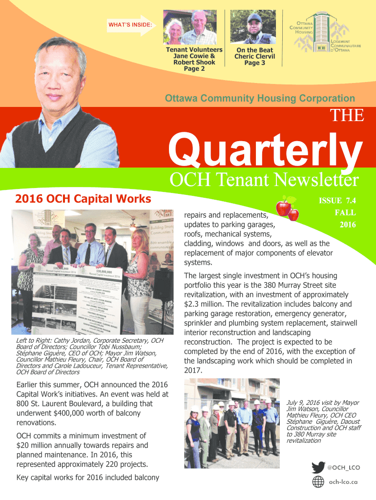 WHAT'S INSIDE:Tenant Volunteers Jane Bowie & Robert Shook Page 2On the Beat Cleric Chervil Page 3Ottawa Community Housing CorporationTHEQuarterly OCH Tenant Newsletter 2016 OCH Capital Worksite 7.4