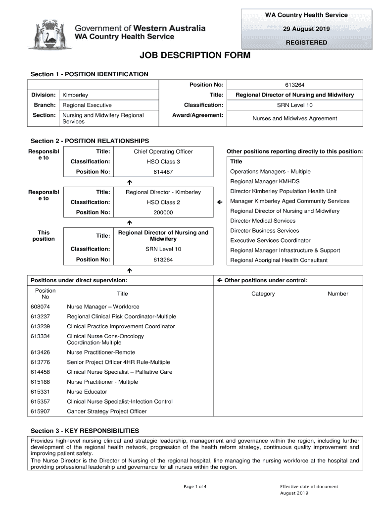 WA Country Health Service 29 August 2019 REGISTERED DESCRIPTION FORM Section 1 POSITION IDENTIFICATION Position No: Division:Title:Kimberley Branch:Regional ExecutiveSection:Nursing and Midwifery
