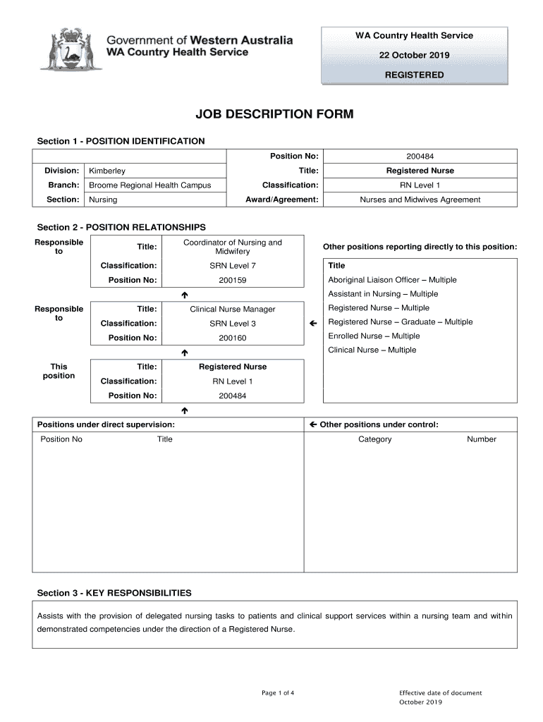 WA Country Health Service 22 October 2019 REGISTERED DESCRIPTION FORM Section 1 POSITION IDENTIFICATION Position No: Division:200484Title:Kimberley Branch:Brooke Regional Health CampusSection:NursingRegistered