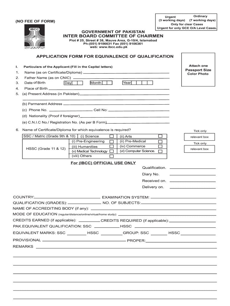 Urgent for only ICE O/A Level Cases.(NO FEE OF FORM)GOVERNMENT OF PAKISTANINTER BOARD COMMITTEE OF CHAIRMEN