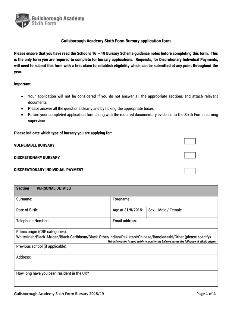 Gainsborough Academy Sixth Form Bursary application form Please ensure that you have read the Schools 16 19 Bursary Scheme guidance notes before completing this form. This is the only form you are