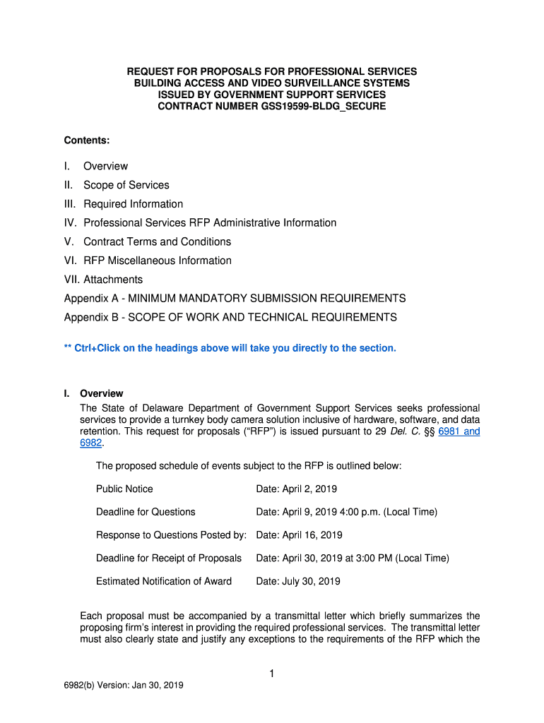 REQUEST FOR PROPOSALS FOR PROFESSIONAL SERVICES BUILDING ACCESS AND VIDEO SURVEILLANCE SYSTEMS ISSUED BY GOVERNMENT SUPPORT SERVICES CONTRACT NUMBER GSS19599BLDG SECURE Contents:I. Overview. Scope