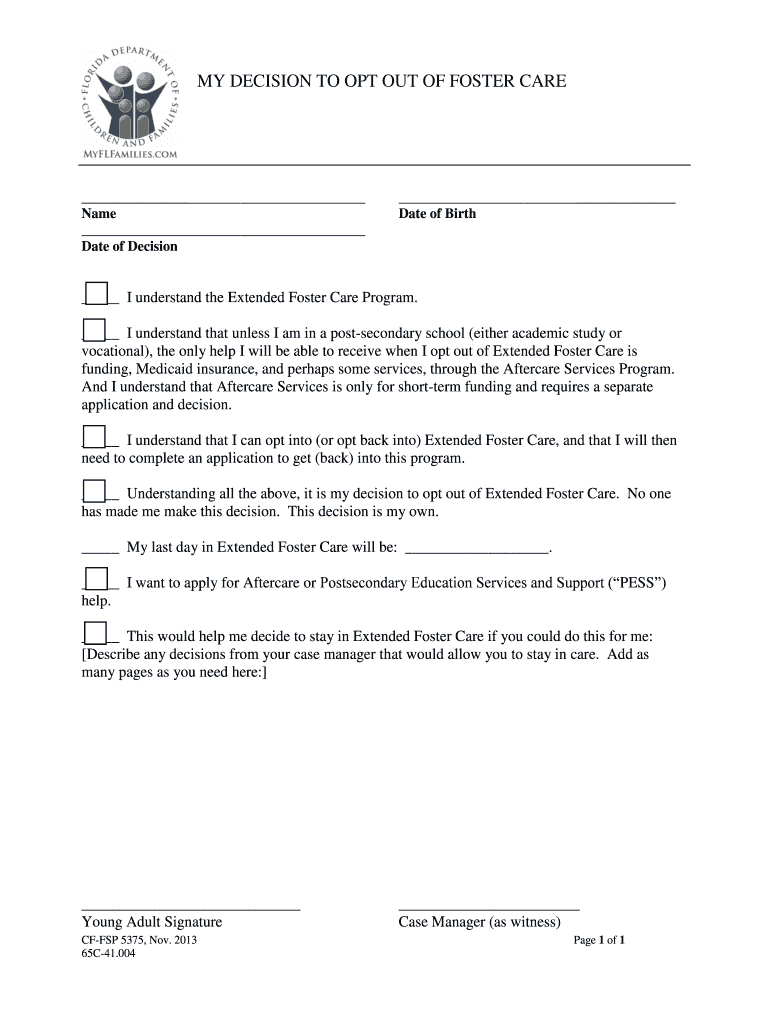 If you have specific concerns, consult your case manager or a legal professional who can provide guidance and support related to the Foster Care Opt-Out Decision Form.
