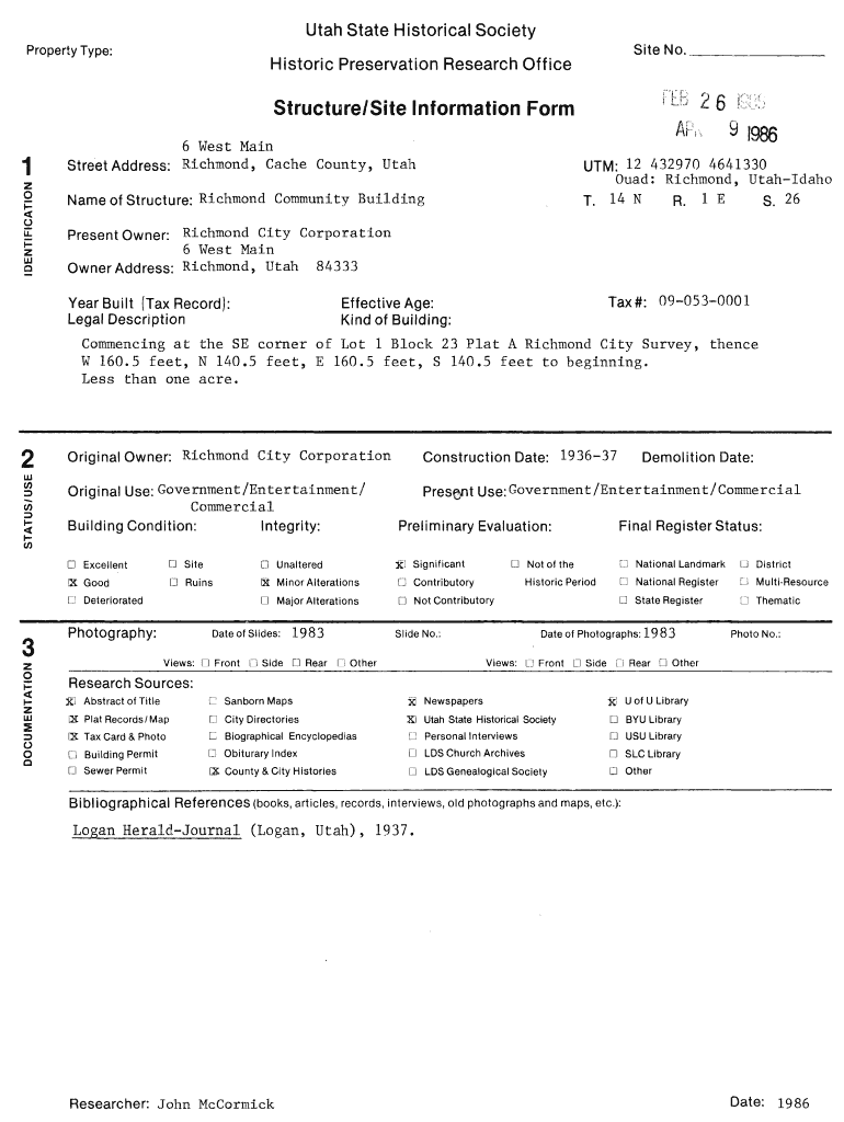 Property Type:Site No. Historic Preservation Research Office 2 6 BOB