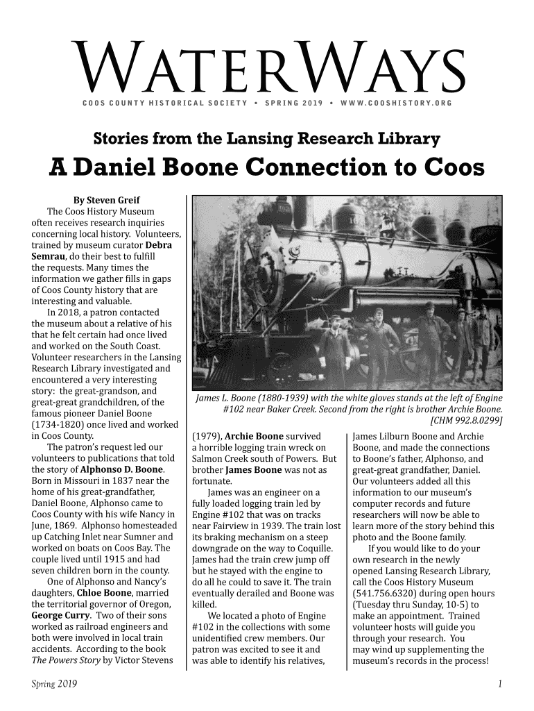 COOS COUNTY HISTORICAL SOCIETY SPR ING 2 019W W. C O O S H I S T O R Y. O R Stories from the Lansing Research Library Daniel Boone Connection to Coos