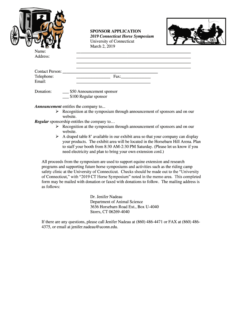 SPONSOR APPLICATION 2019 Connecticut Horse Symposium University of Connecticut March 2, 2019, Name: Address: Contact Person: Telephone: Fax: Email: Donation: $50 Announcement sponsor $100 Regular