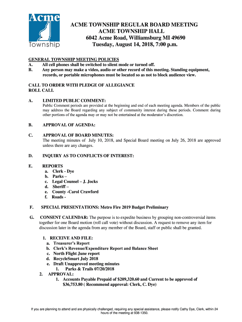 ACME TOWNSHIP REGULAR BOARD MEETING
