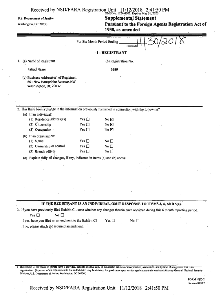 Received by NSW/FAR Registration Unit 11/12/2018 2:41:50 PM OMB No. 11240002; Expires May 31,2020u.s. Department of justiceSupplemental Statement Pursuant to the Foreign Agents Registration Act of