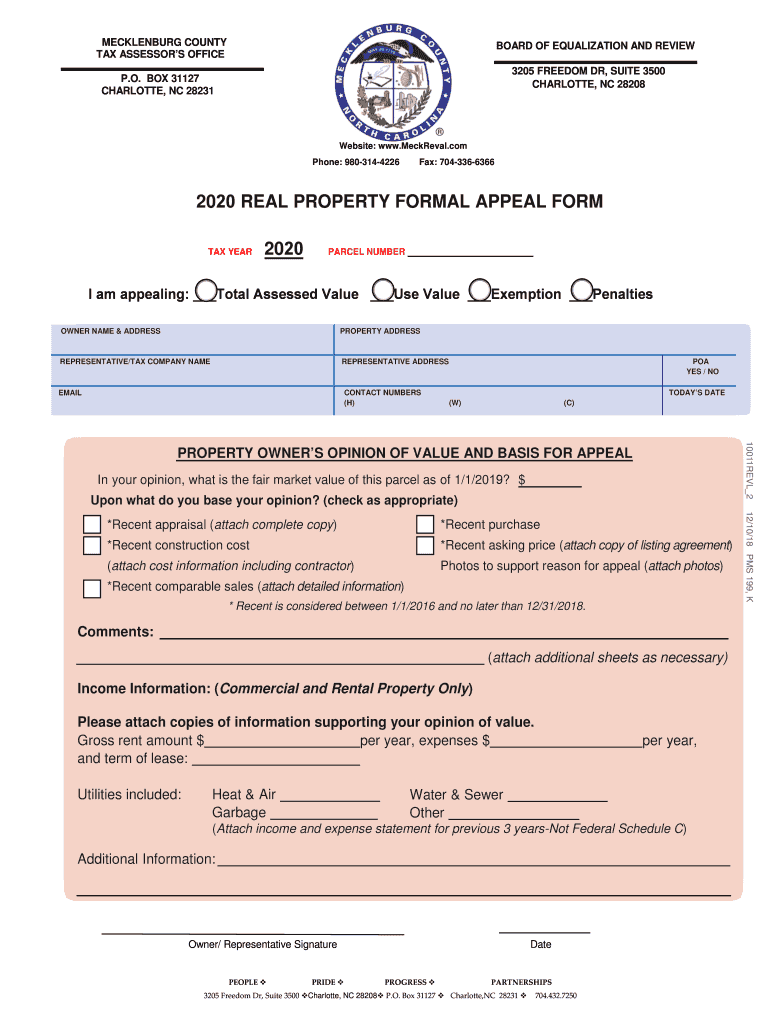 Get the free How do I appeal my new Mecklenburg County, NC tax value ...