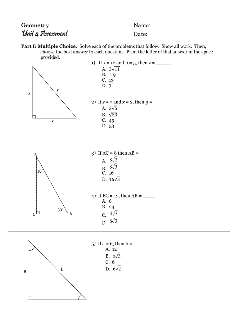 GeometryName:Unit 4 AssessmentDate:Part I: Multiple Choice. Solve each of the problems that follow. Show all work. Then, choose the best answer to each question. Print the letter of that answer in