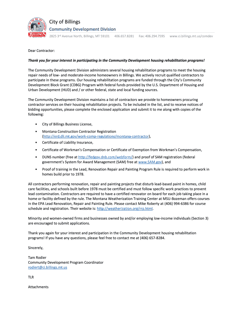 2825 3rd Avenue North, Billings, MT 59101406.657.8281Fax: 406.294.7595www.CI.billings.mt.us/comdevDear Contractor: