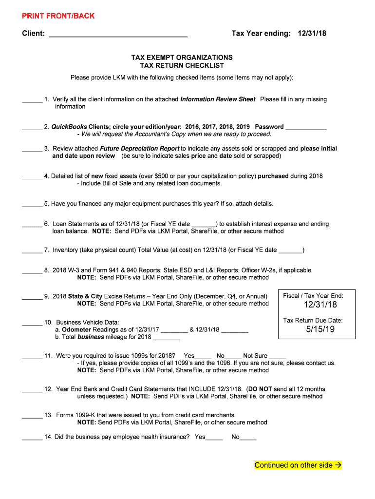 PRINT FRONT/BACK Client:Tax Year ending: 12/31/18 TAX EXEMPT ORGANIZATIONS TAX RETURN CHECKLIST Please provide LKM with the following checked items (some items may not apply): 1. Verify all the client