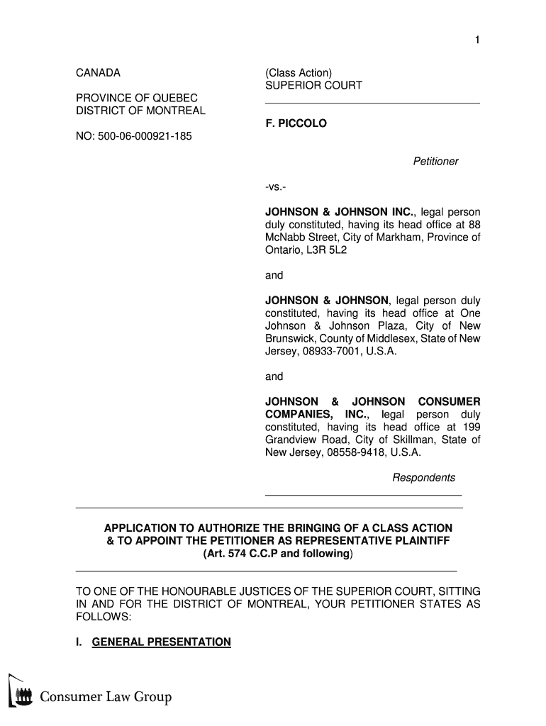 1 CANADA PROVINCE OF QUEBEC DISTRICT OF MONTREAL(Class Action) SUPERIOR COURT F. PICCOLO NO: 50006000921185 Petitioner vs. JOHNSON & JOHNSON INC., legal person duly constituted, having its head office