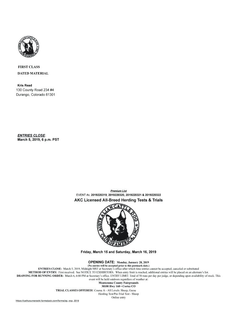 FIRST CLASS DATED MATERIAL Kris Read130 County Road 234 #4 Durango, Colorado 81301ENTRIES CLOSE: March 5, 2019:6 p.m. Premium Listen #s: 2019220319, 2019220320, 2019220321 & 2019220322AKC Licensed