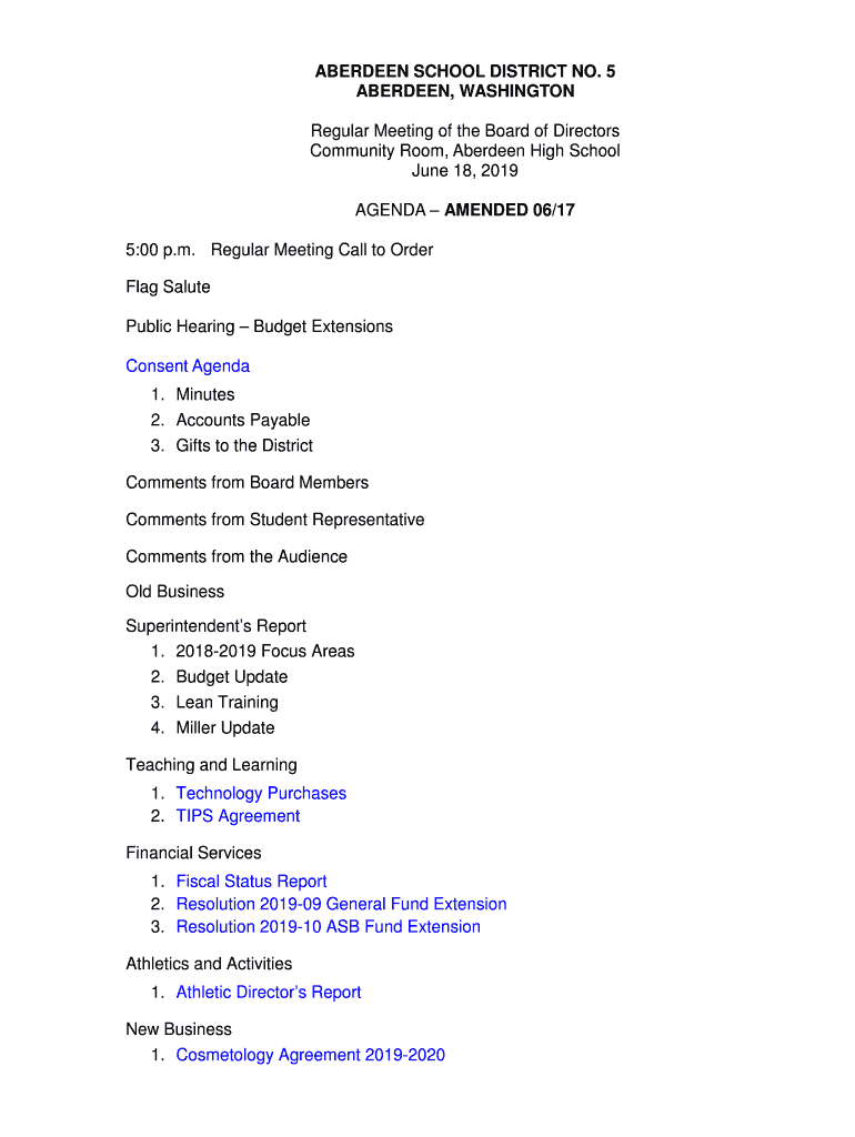 ABERDEEN SCHOOL DISTRICT NO. 5 ABERDEEN, WASHINGTON Regular Meeting of the Board of Directors Community Room, Aberdeen High School June 18, 2019, AGENDA AMENDED 06/17 5:00 p.m. Regular Meeting Call