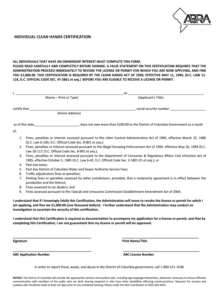 Get the free INDIVIDUAL CLEAN HANDS CERTIFICATION - abra dc
