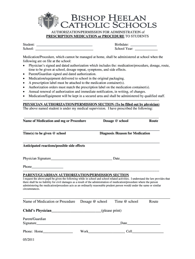 AUTHORIZATION/PERMISSION FOR ADMINISTRATION of PRESCRIPTION MEDICATION or PROCEDURE TO STUDENTS Student: School: Birthdate: School Year: Medication/Procedure, which cannot be managed at home, shall