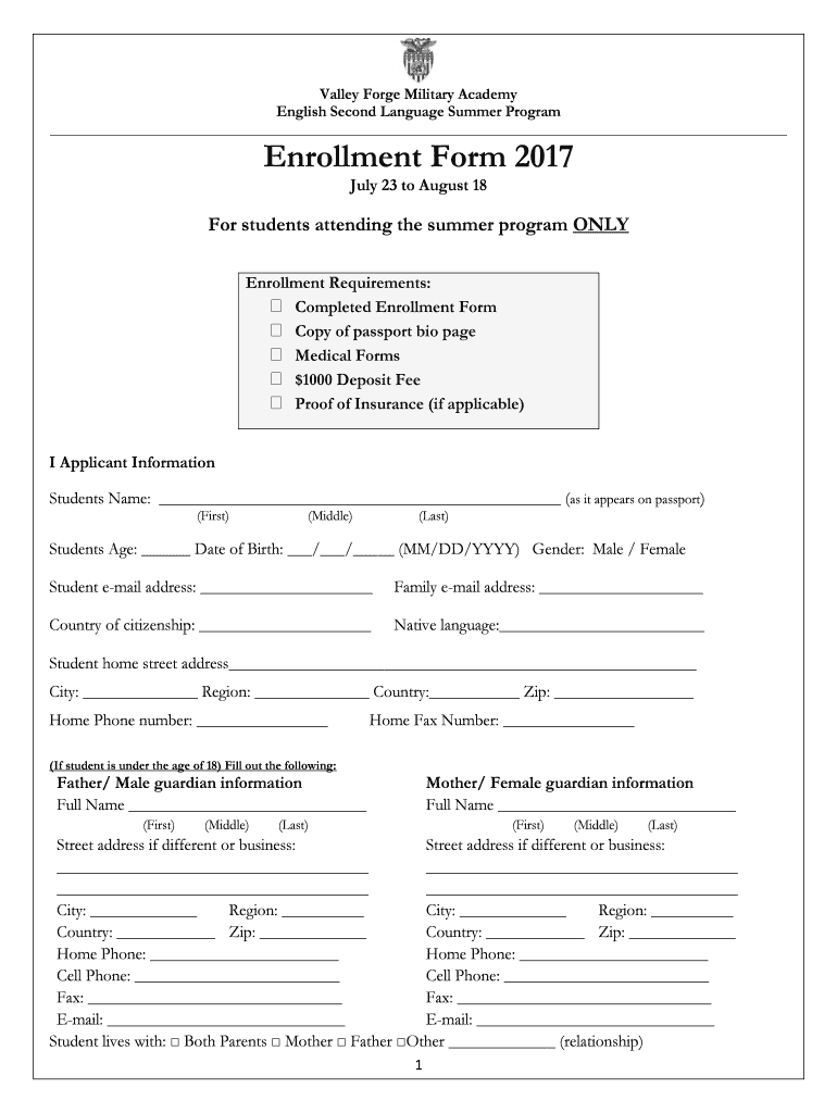 Valley Forge Military Academy English Second Language Summer Program Enrollment Form 2017 July 23 to August 18For students attending the summer program ONLY Enrollment Requirements: Completed Enrollment