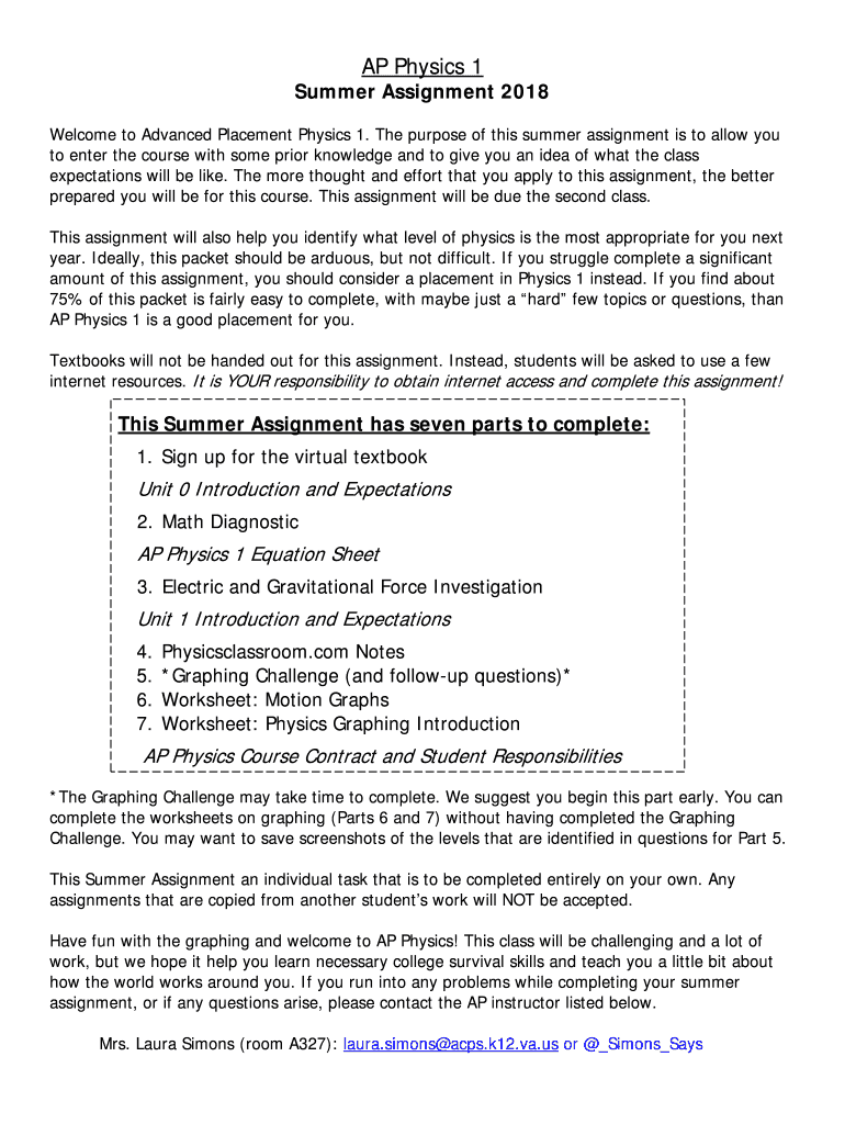 Get the free AP PHYSICS 1 SUMMER ASSIGNMENT - Frisco ISD Schools