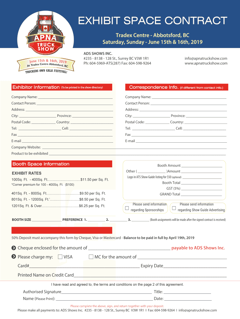 EXHIBIT SPACE CONTRACT Trade Center Abbotsford, BC Saturday, Sunday, June 15th & 16th, 2019 ADS SHOWS INC. #235 8138 128 St., Surrey BC V3W 1R1 pH: 6045969ATS(287) Fax: 6045989264June 15th & 16th,