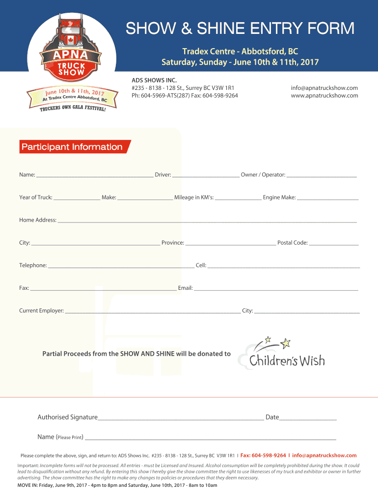 SHOW & SHINE ENTRY FORM Trade Center Abbotsford, BC Saturday, Sunday, June 10th & 11th, 2017 June 10th & 11th, 2017ex Center Abbotsford, B At Trade CADS SHOWS INC. #235 8138 128 St., Surrey BC V3W